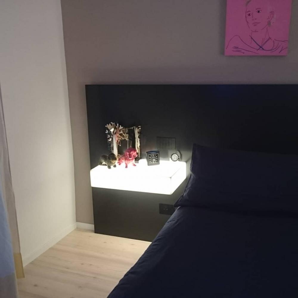 Testiera letto retroilluminata in Corian DEEP TITANIUM; mensola comodino in Corian traslucente GLACIER ICE; mobile cassettiera sospesa rivestita in Corian DEEP TITANIUM; cornice porta TV in Corian DEE...