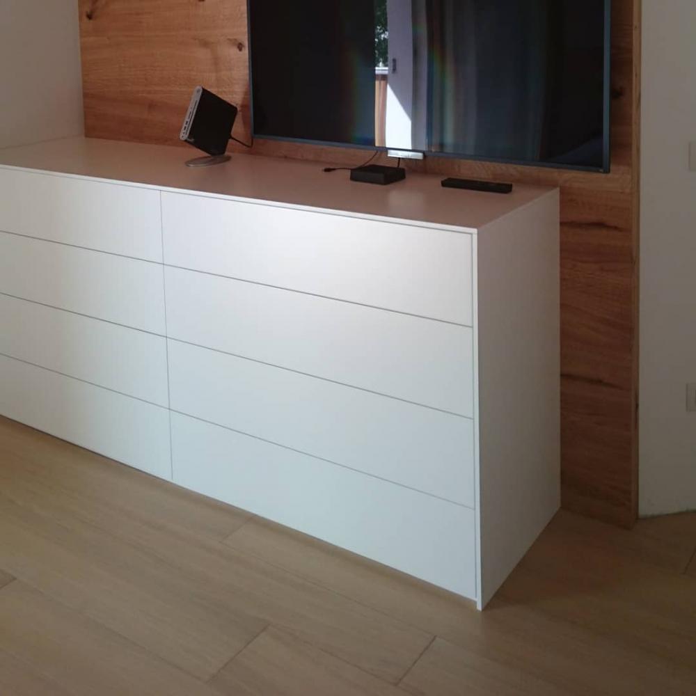 Rivestimento a parete in rovere con nodi e cassettiera laccata con cassetti spingiapri; luci led; Armadio guardaroba, sopra il vano scale, con ante scorrevoli in rovere rustico