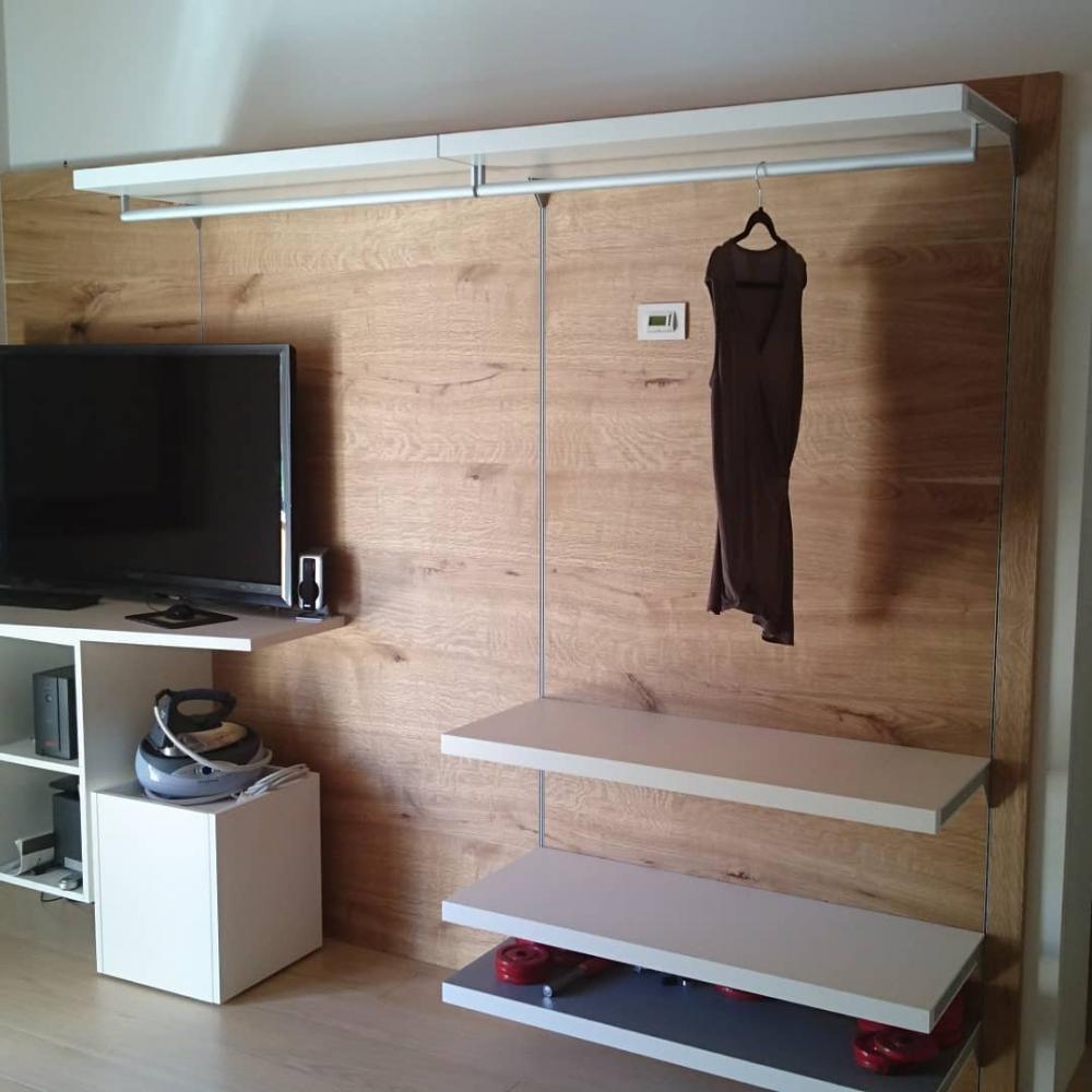parete in rovere con nodi, con cremagliere e mensole laccate regolabili ;luci led