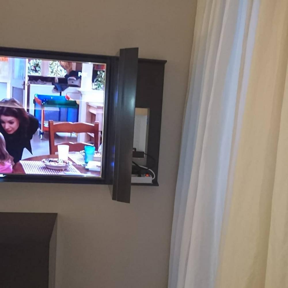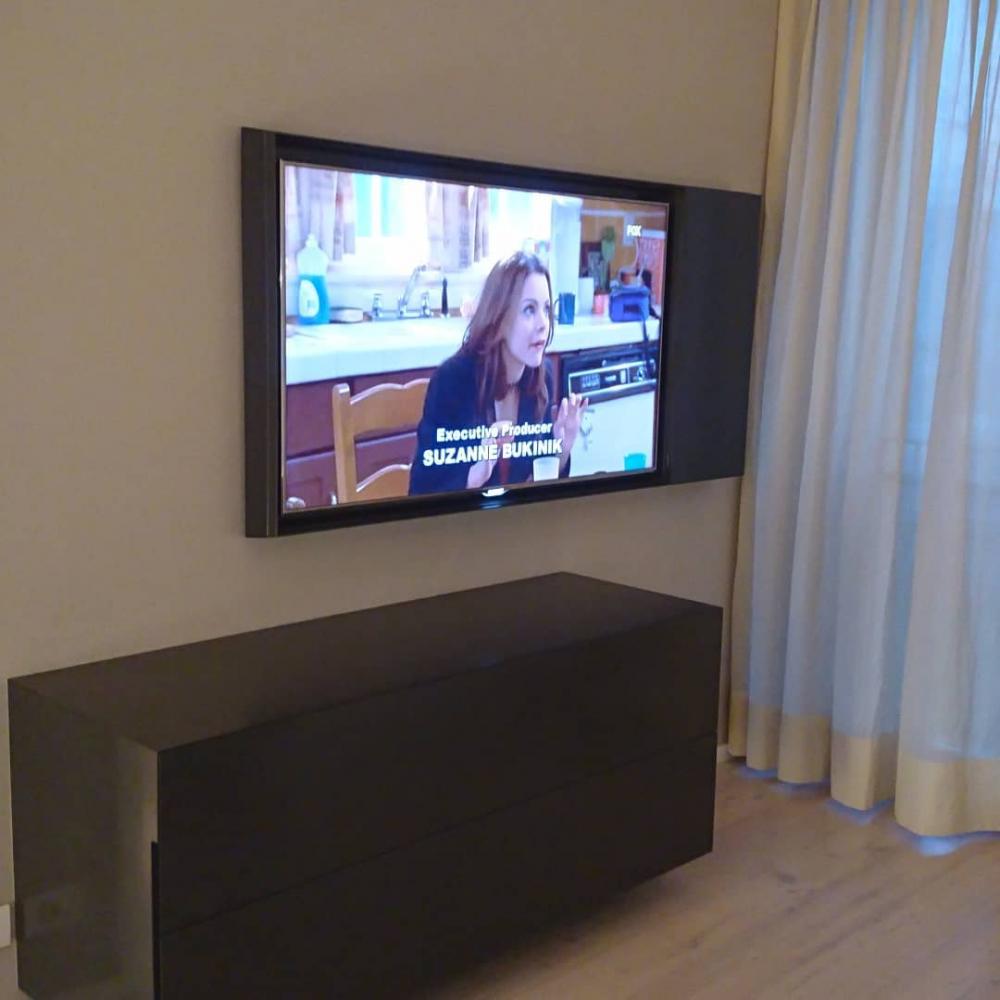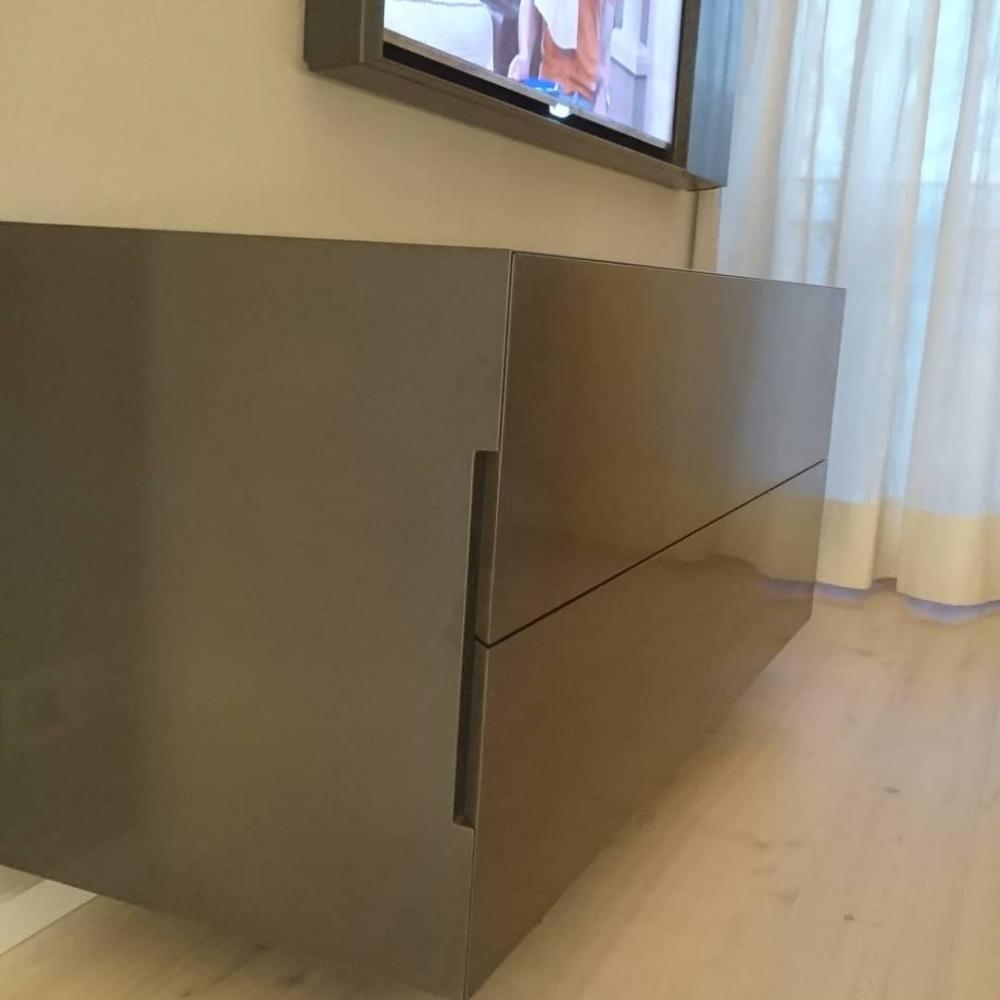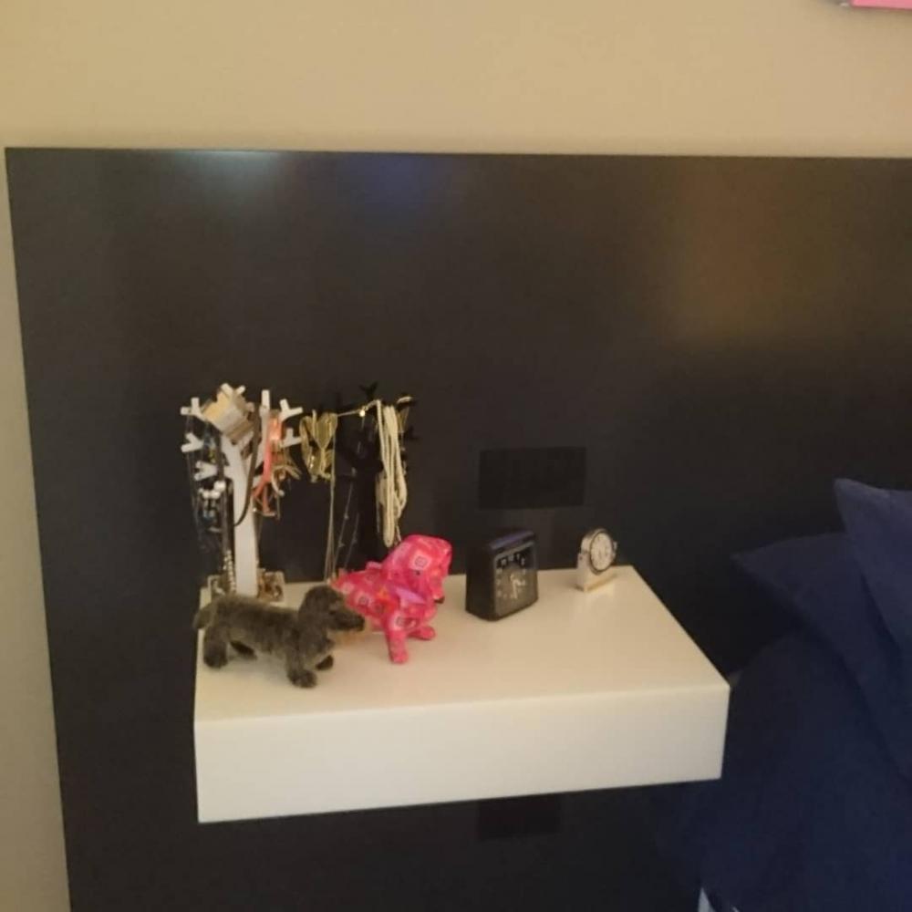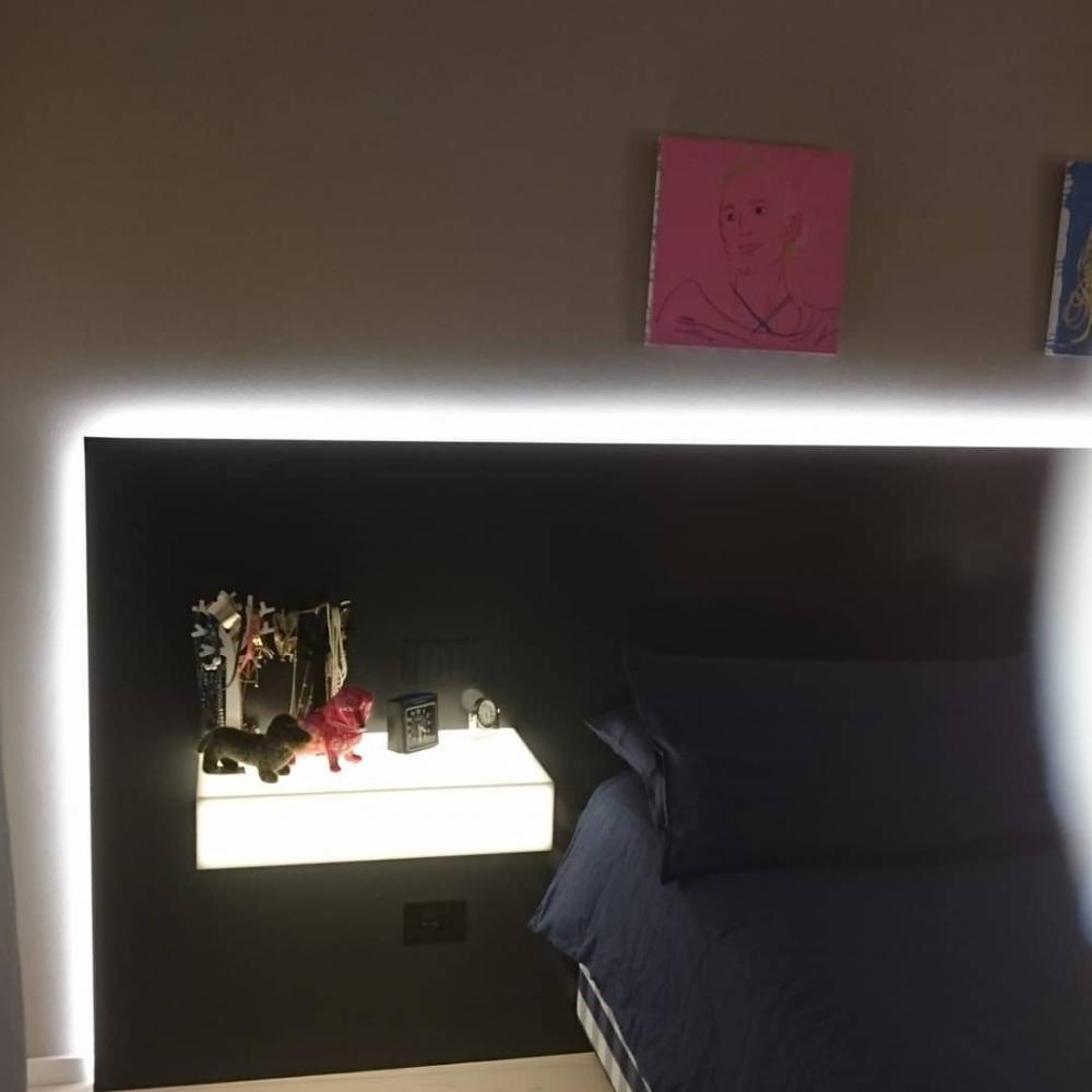 Testiera letto retroilluminata in Corian DEEP TITANIUM; mensola comodino in Corian traslucente GLACIER ICE; mobile cassettiera sospesa rivestita in Corian DEEP TITANIUM; cornice porta TV in Corian DEEP TITANIUM con vano per decoder.